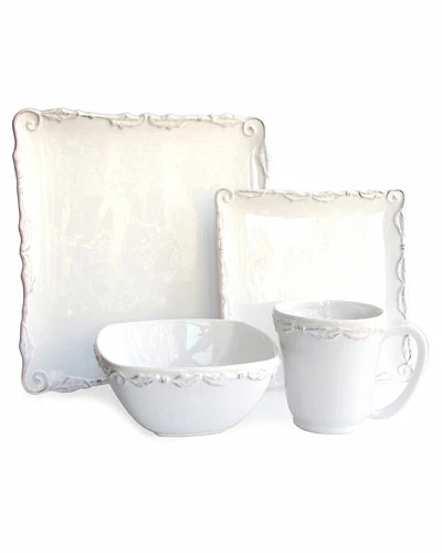 - Flip through your recipe books, mix up some drinks, and invite over your friends it’s time for brunch! Before the guests arrive, set the scene for your sophisticated soiree. First, place a distressed oak table and white Parsons chairs in your dining room, then top your table with this elegant dinnerware set. The sixteen pieces are perfect for any occasion, while the crisp white finish and scrolling border detailing imbue this set with cottage-chic charm. Next, pair these pieces with a blue and white striped runner and a pink hydrangea centerpiece. Now that your table’s set, bring out a stack of chocolate chip waffles, a pitcher of mimosas, and spinach quiche, then sit back and enjoy your delicious spread with friends.