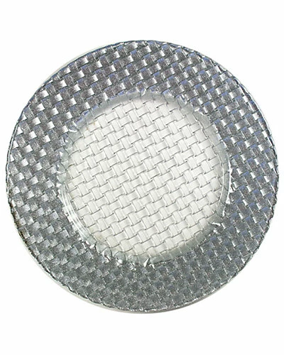 - Add drama to your table setting with these silver glitter glass chargers enhanced with a braided detail